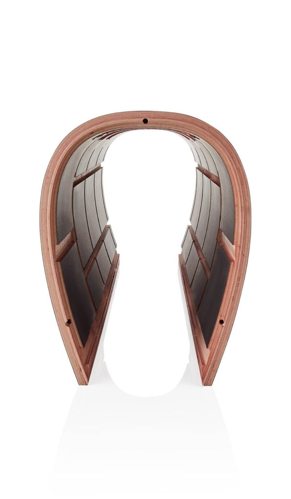La curvatura del Reverse Wrap es, en sí misma, un elemento clave de su éxito. Al colocar las unidades de accionamiento del altavoz en la parte delantera del altavoz, en el centro de su forma curvada, el diseño controla la resonancia no deseada de forma mucho más eficaz: cualquier vibración de las unidades de accionamiento se dirige hacia la pieza más rígida de toda la estructura, la sección de material más alejada de los «extremos» del Wrap. Para controlar aún más esa resonancia, ahora utilizamos una placa de refuerzo de aluminio atornillada al interior de la caja, exactamente como hemos hecho anteriormente con nuestros altavoces más grandes, lo que, una vez más, supone una gran ventaja para la capacidad del altavoz de controlar la resonancia no deseada.